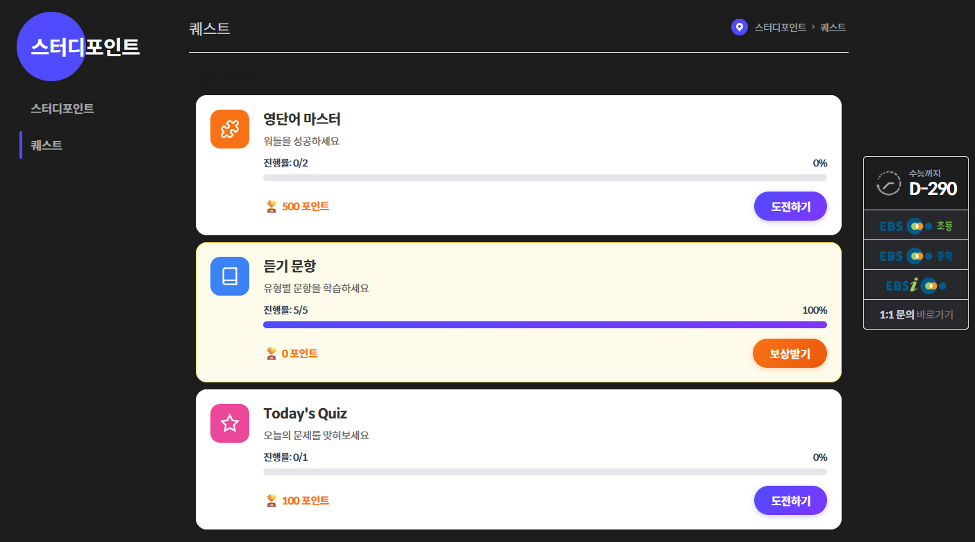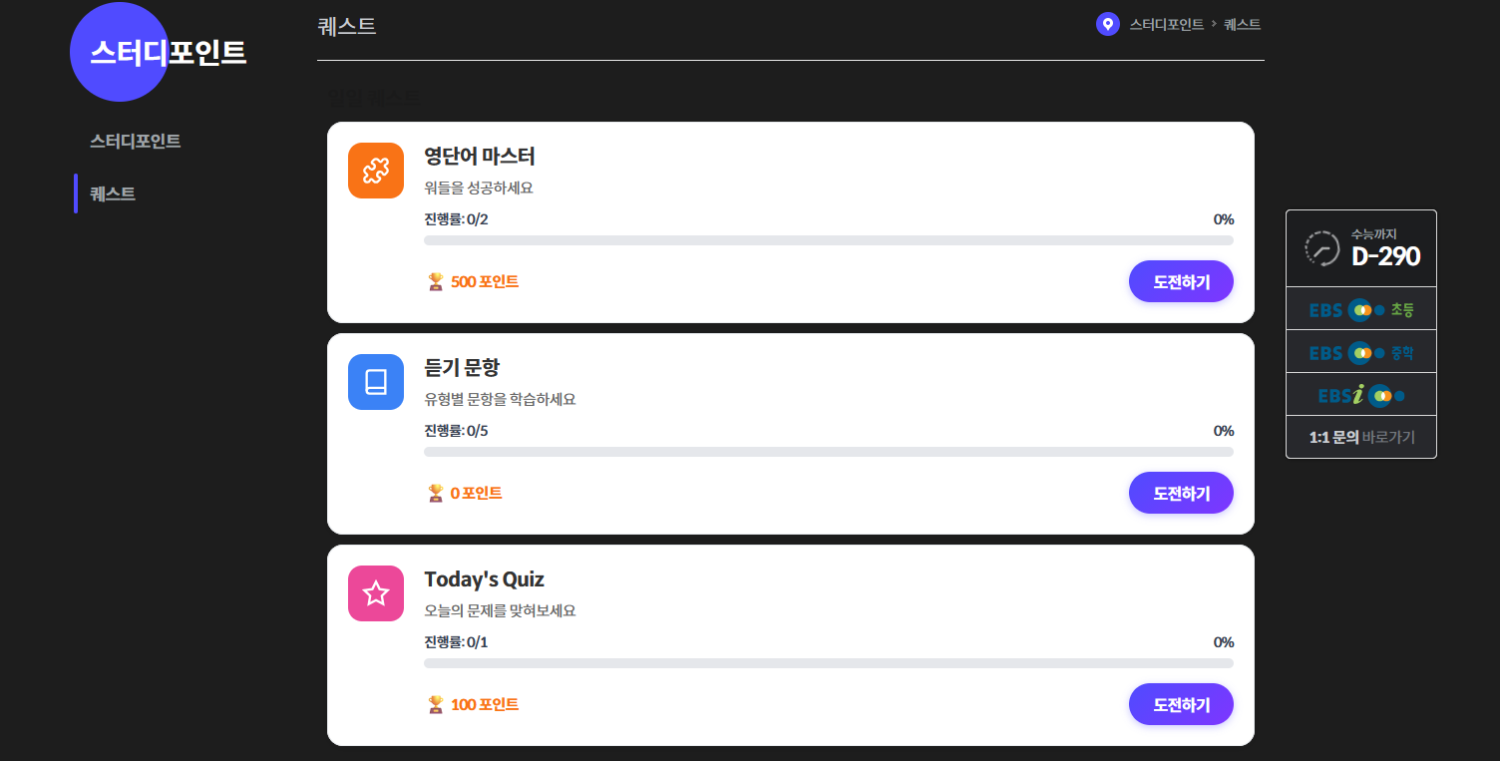 퀘스트는 웹페이지 내 ‘스터디포인트’ 메뉴 하단에 위치해 있습니다.